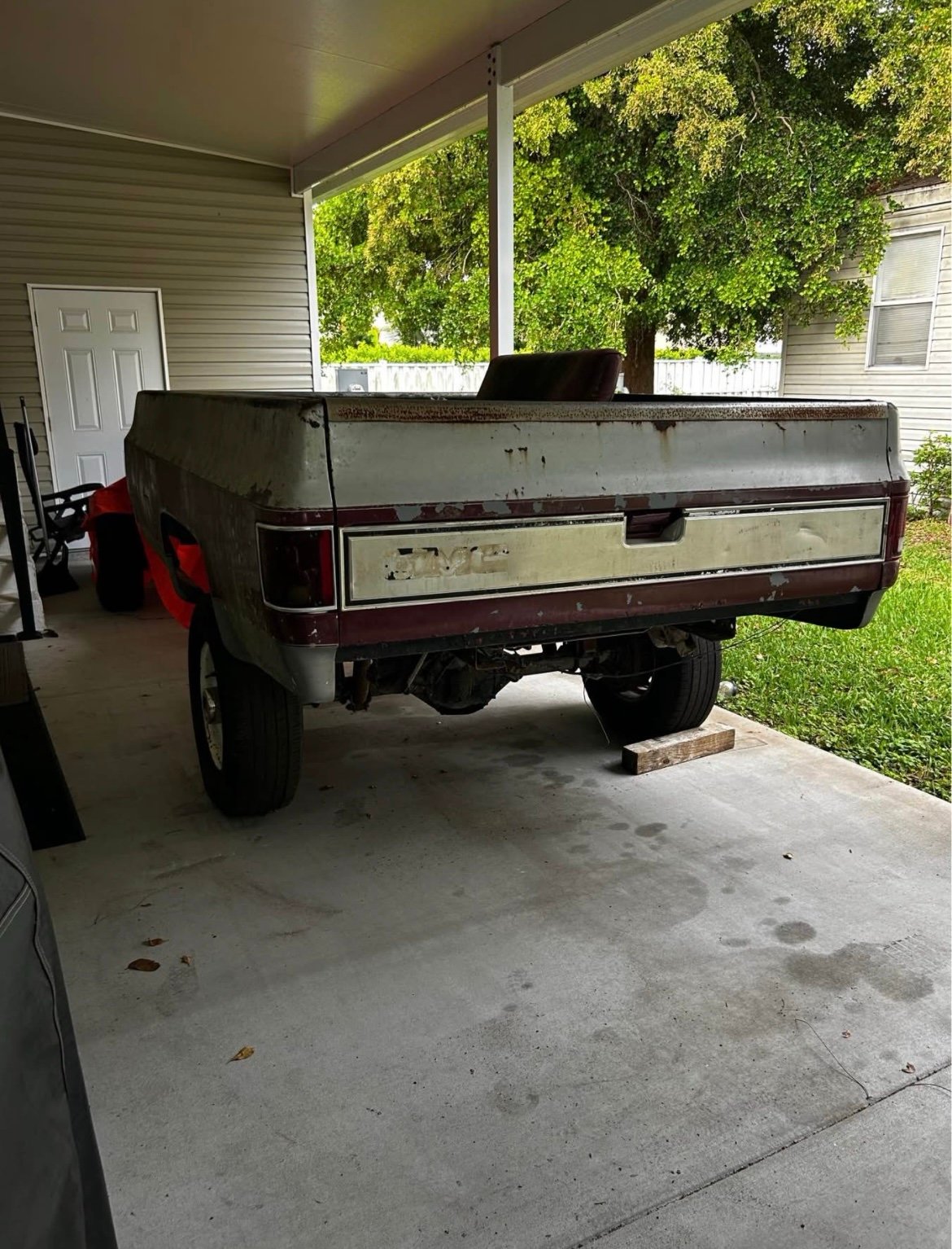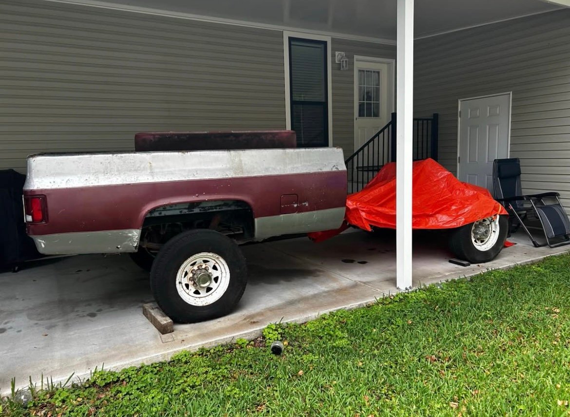 1983 Chevy square body K20 4×4 frame, with box, driveshafts, and transfer case. Comes with a 14 bolt rear end, not pictured. Frame has scaling which is easily cleaned up, box has a good floor.