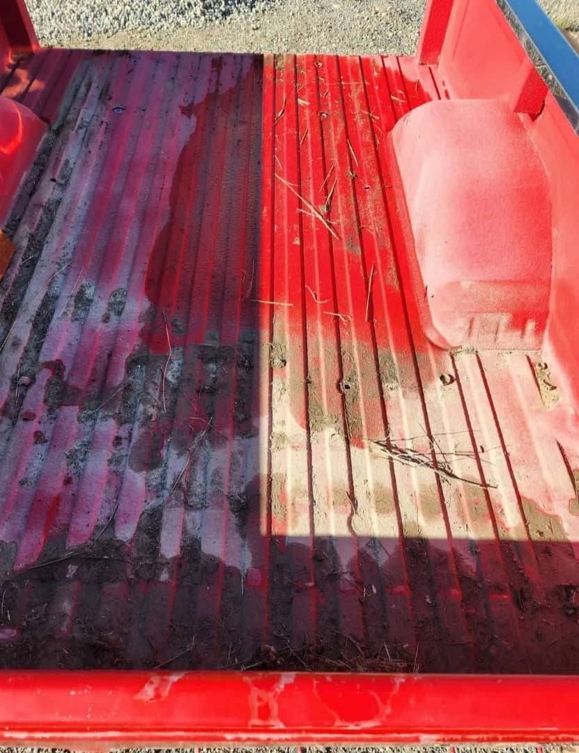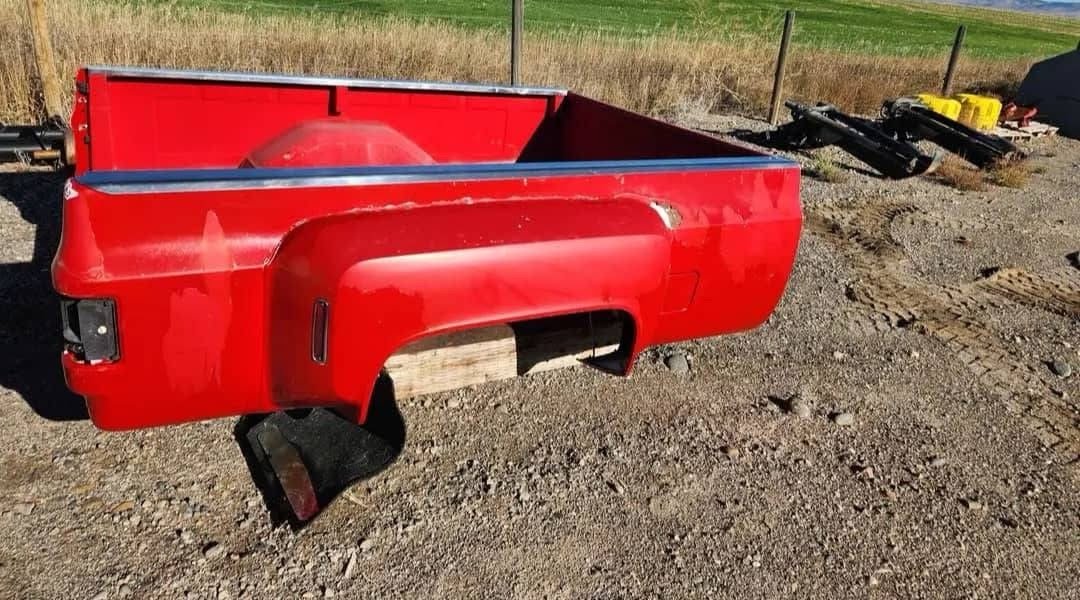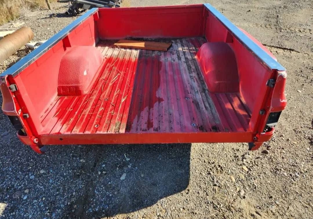 Dually bed off of 80,s chevy truck. In good shape, no tail gate no rust front driver side pushed up some from how was unloaded, but doest look creased.