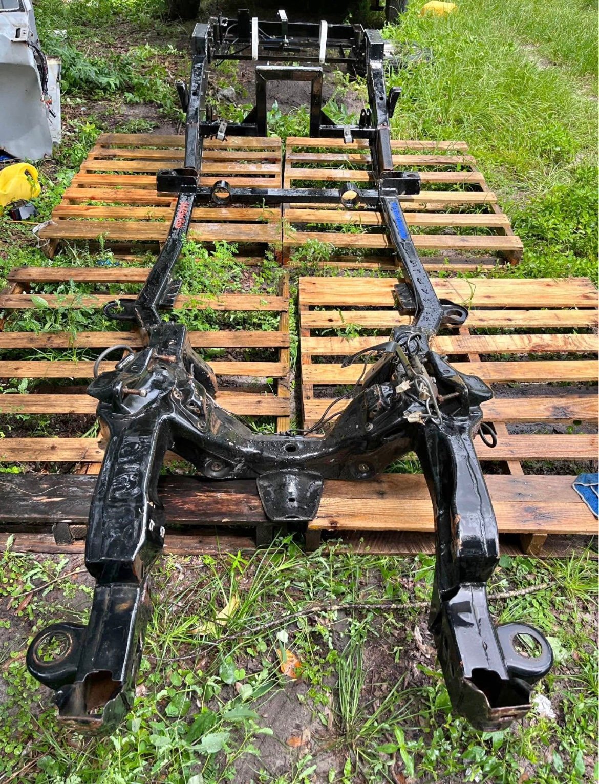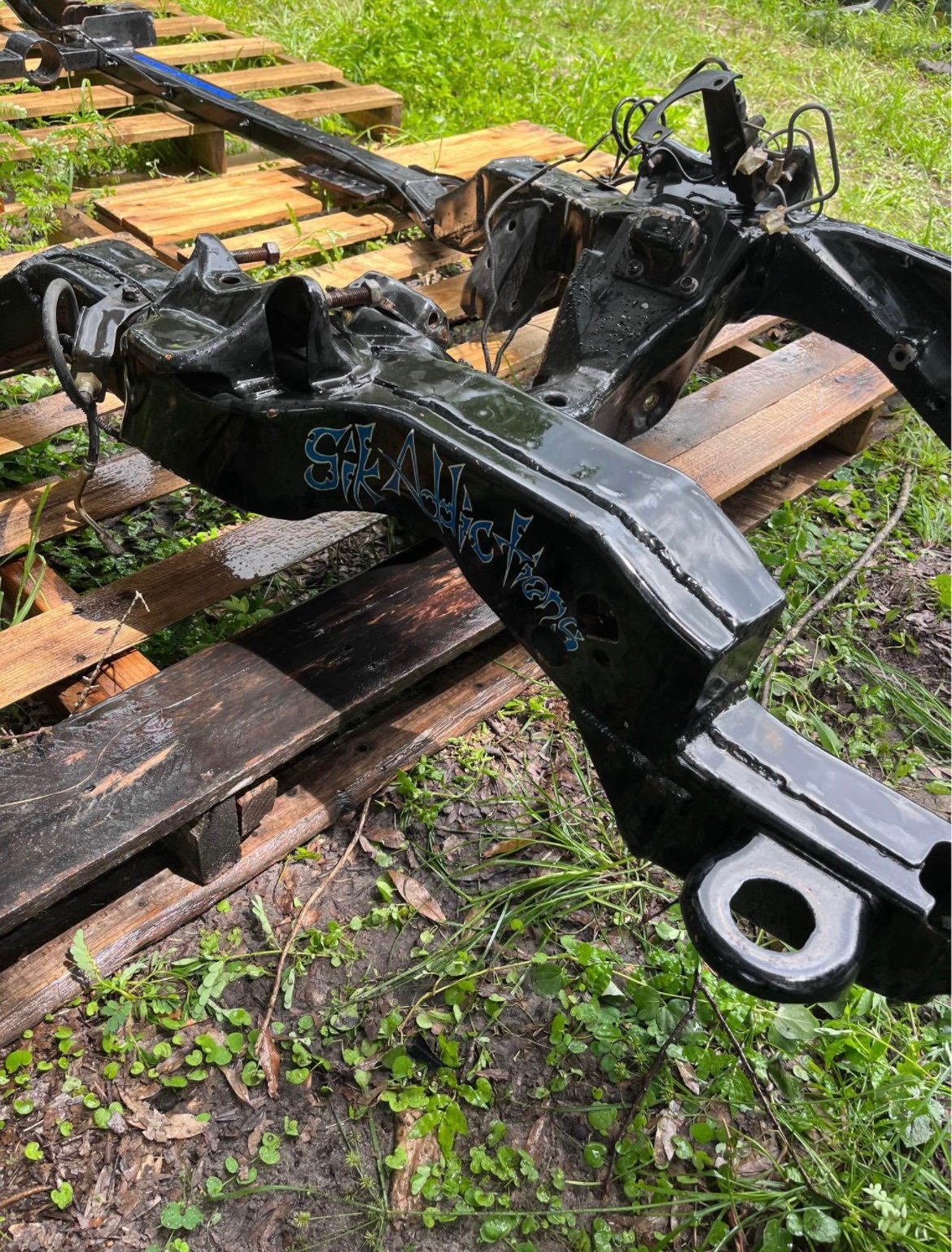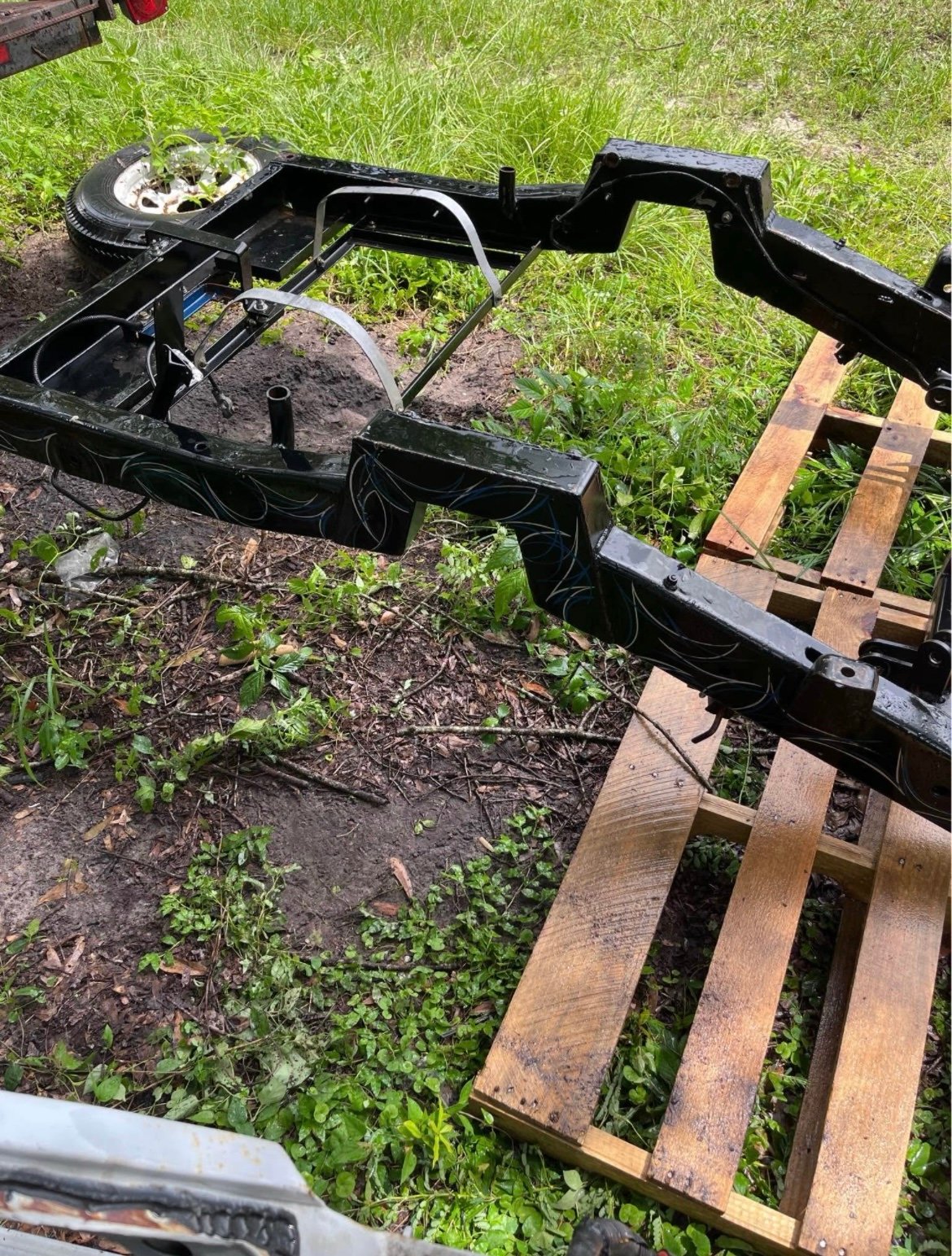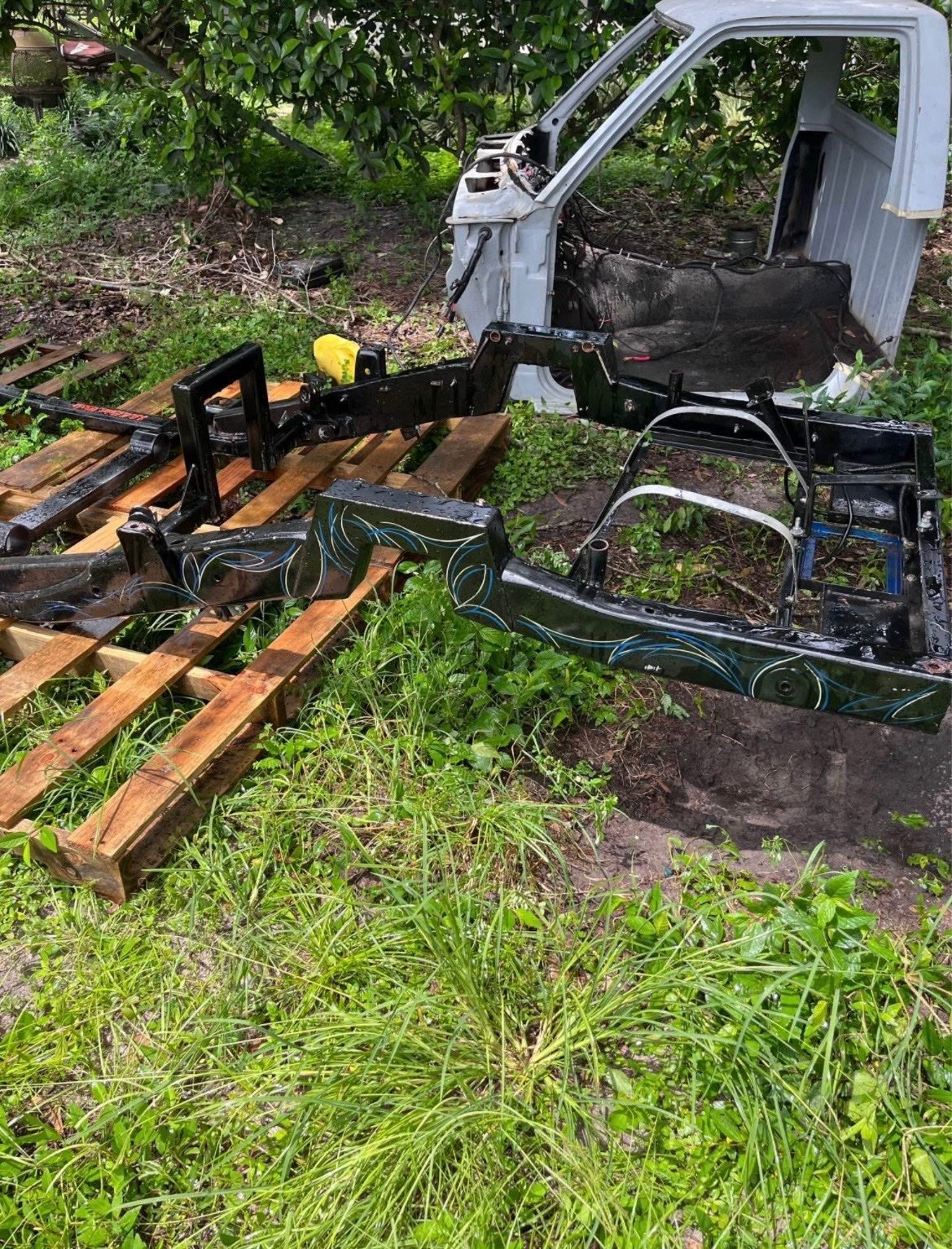 This is a frame from a bagged and bodied v8 s10 you can see the work done to it truck has been all pulled apart frame is all painted and has custom pin stripes firm on price check other listing Is for more parts this is a short bed regular cab will sell frame bed fenders and doors all together