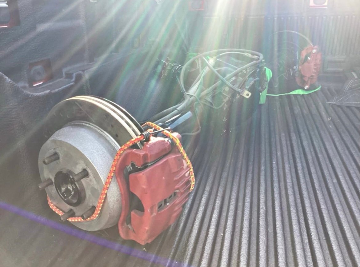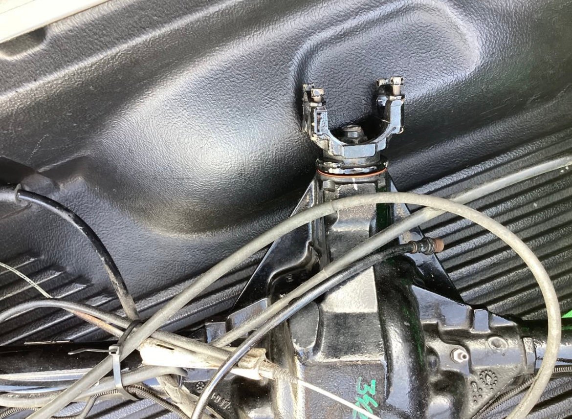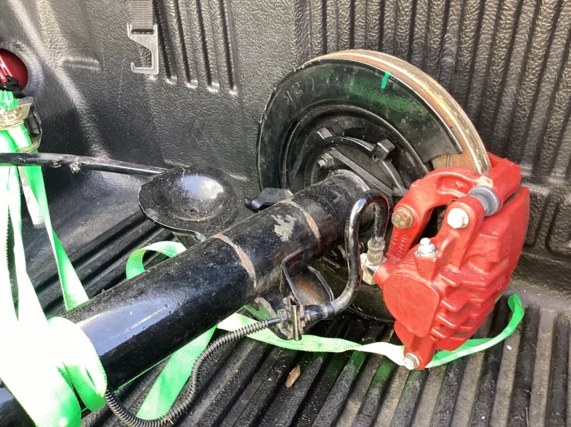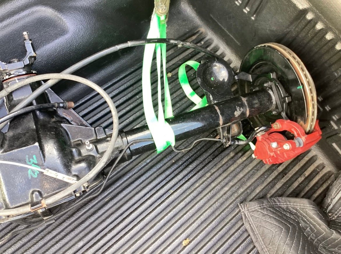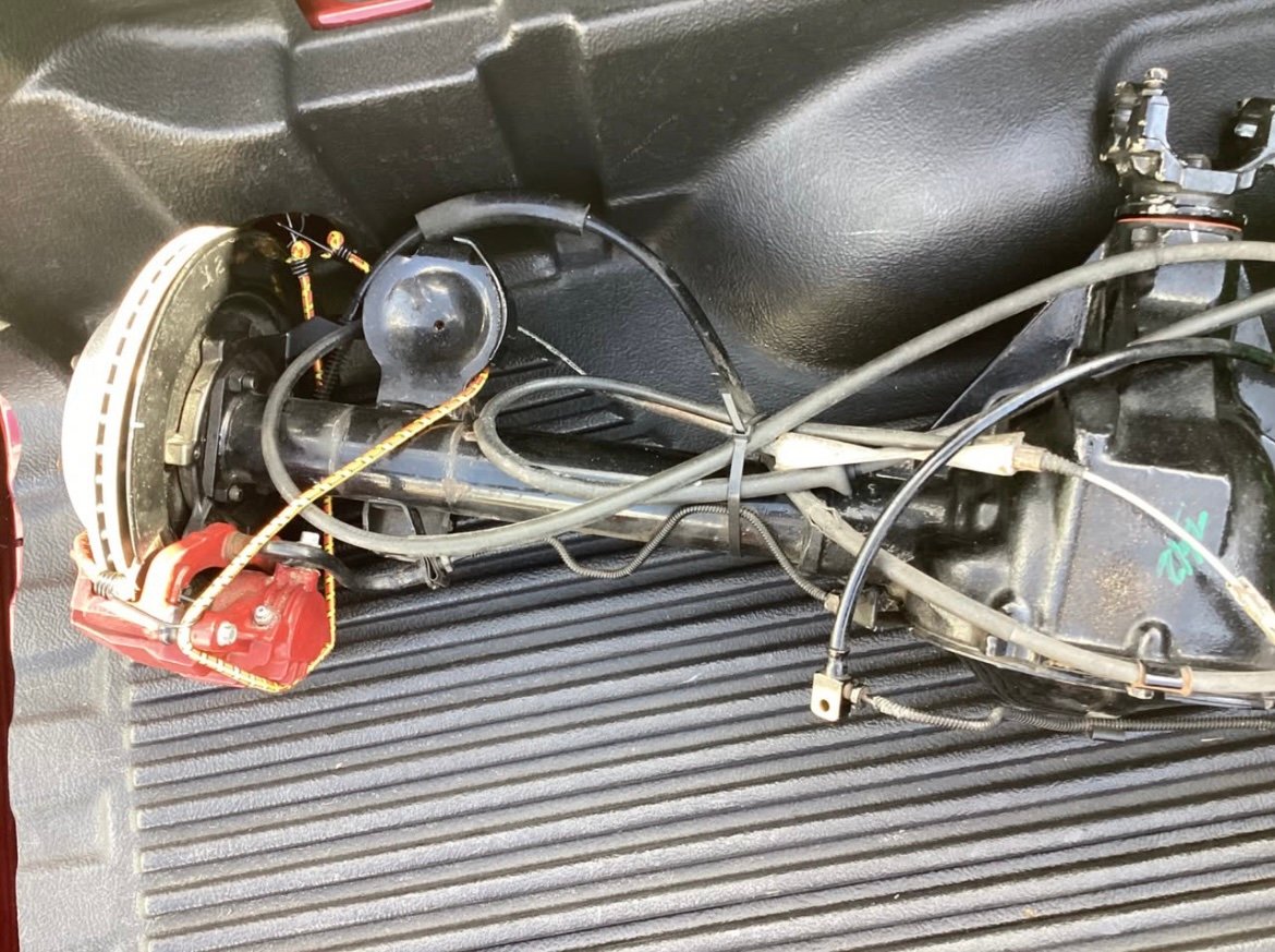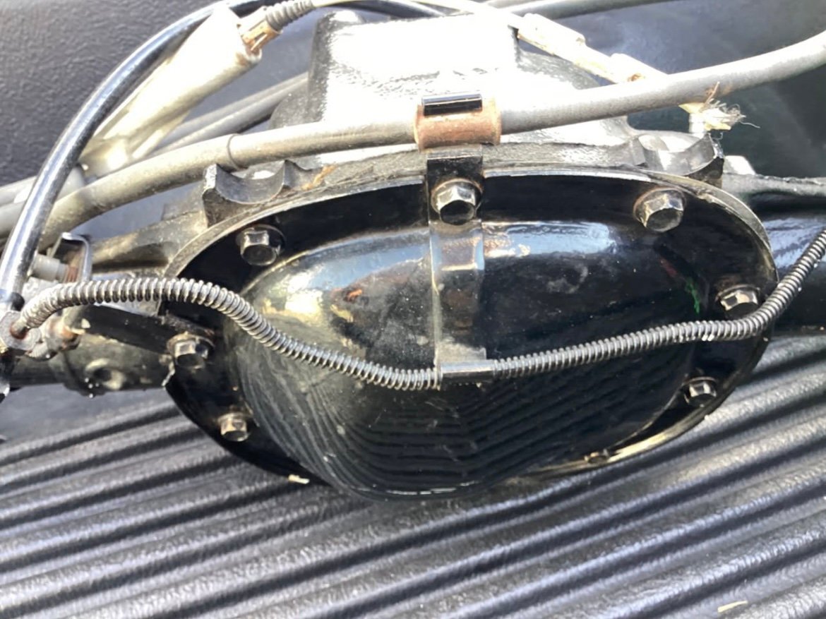 Complete rear end with disc brakes. Powder coated black. Non-posi unit. 3:42 gear ratio 5X4.75 bolt pattern. 54.5 inch from mating surface to mating surface.