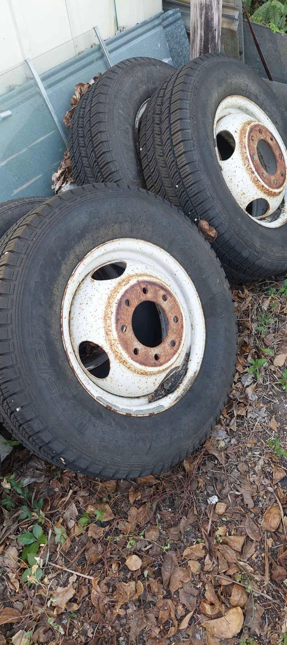 3 extra Squarebody 3500 Dually stock wheels left from a project. Wheels are in good shape for the age. Tires are old but hold air. Have 2 or 3 of the lugnut locking rings that are included, no caps. 8×165 bolt pattern.