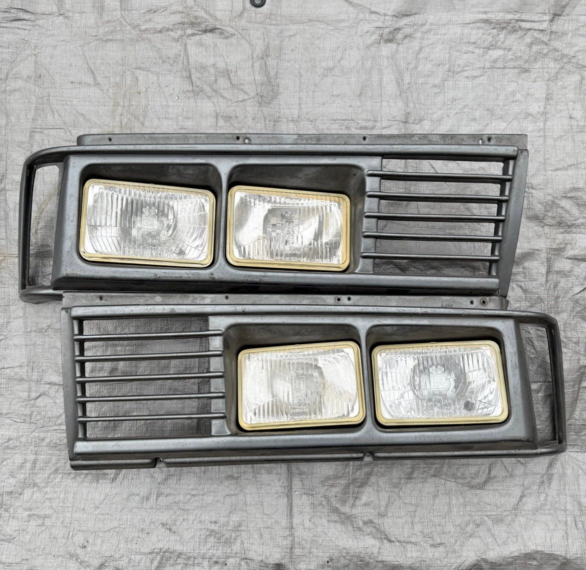 a set of E21 Taifun headlights. Includes grilles as well as the proper Hella H1/H4 lights. The grilles were painted Anthrazit at some point. Overall good shape, some minor imperfections from age.