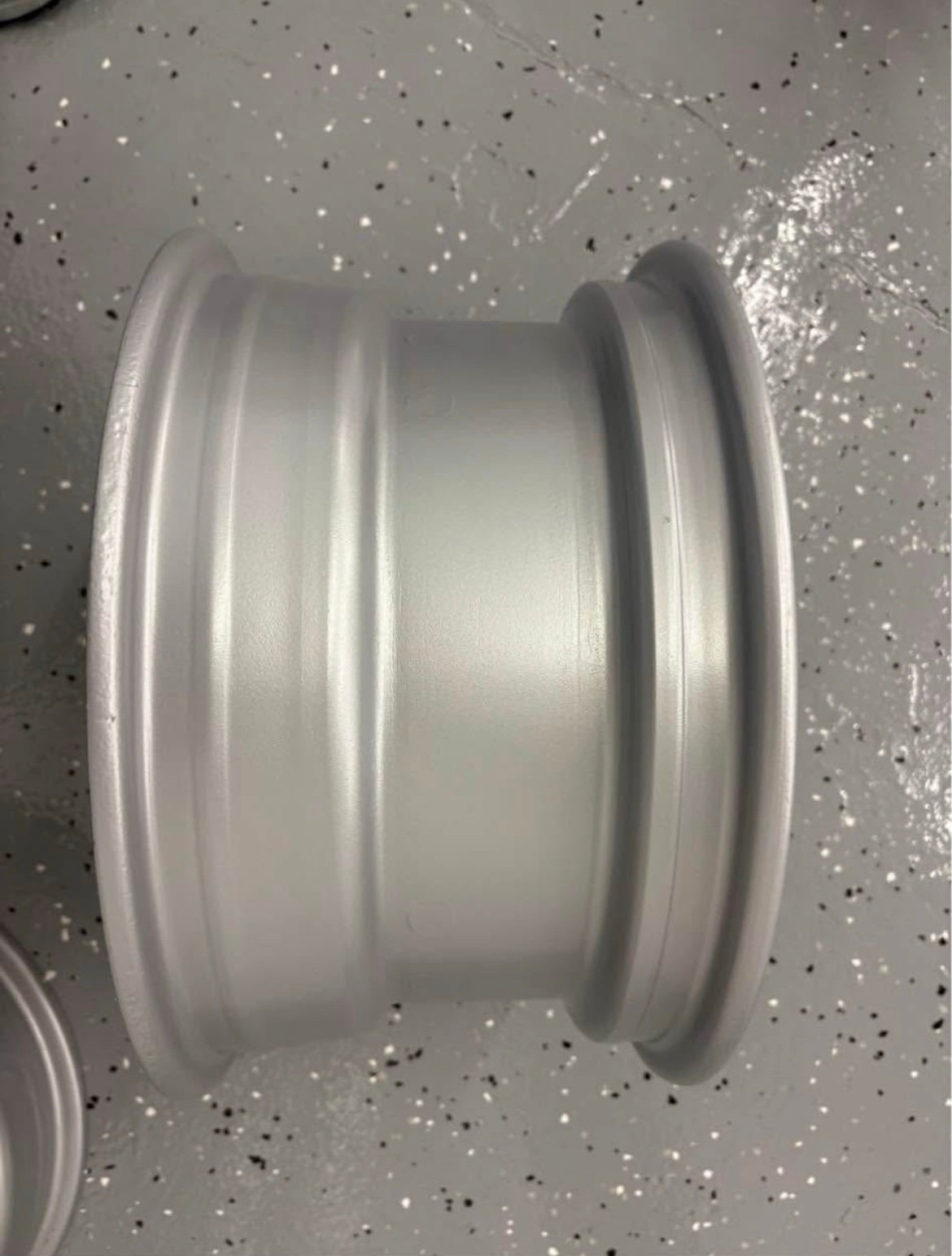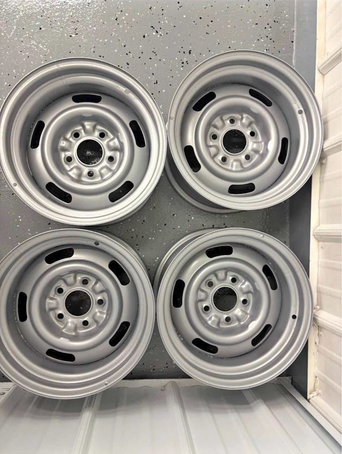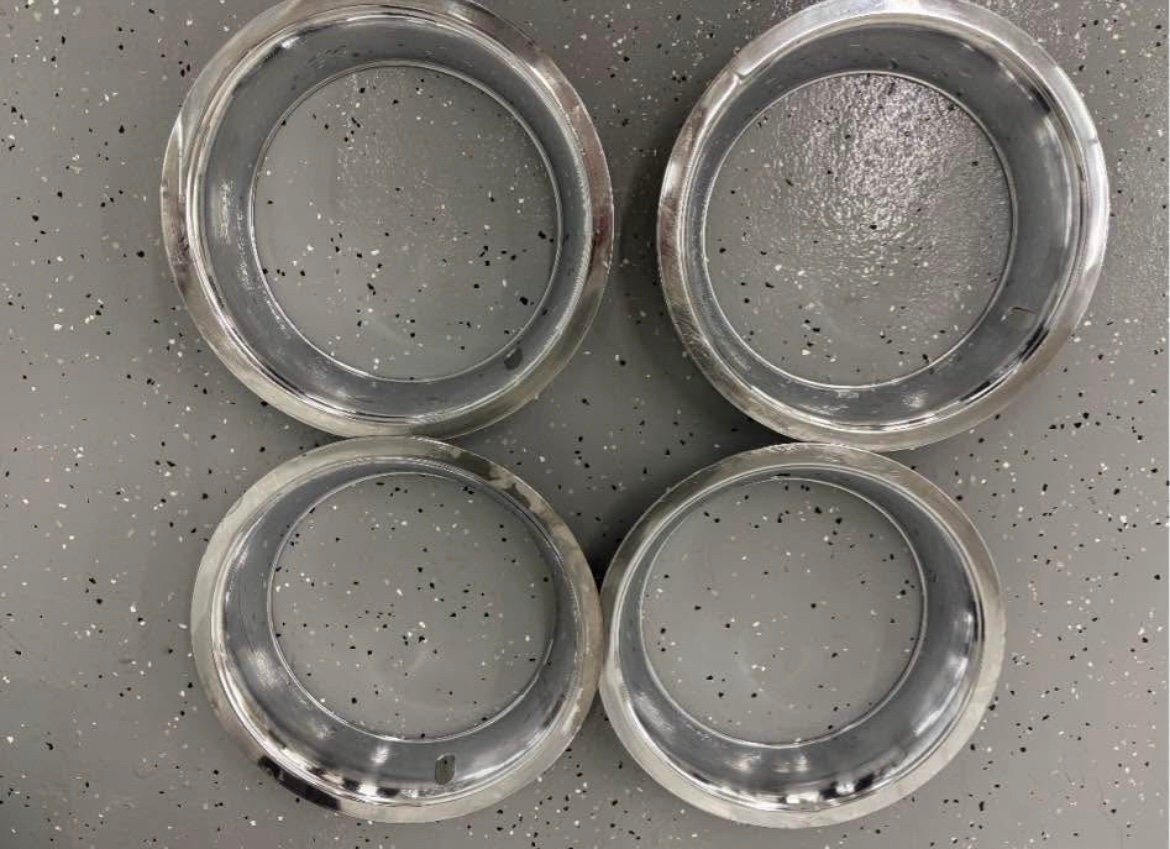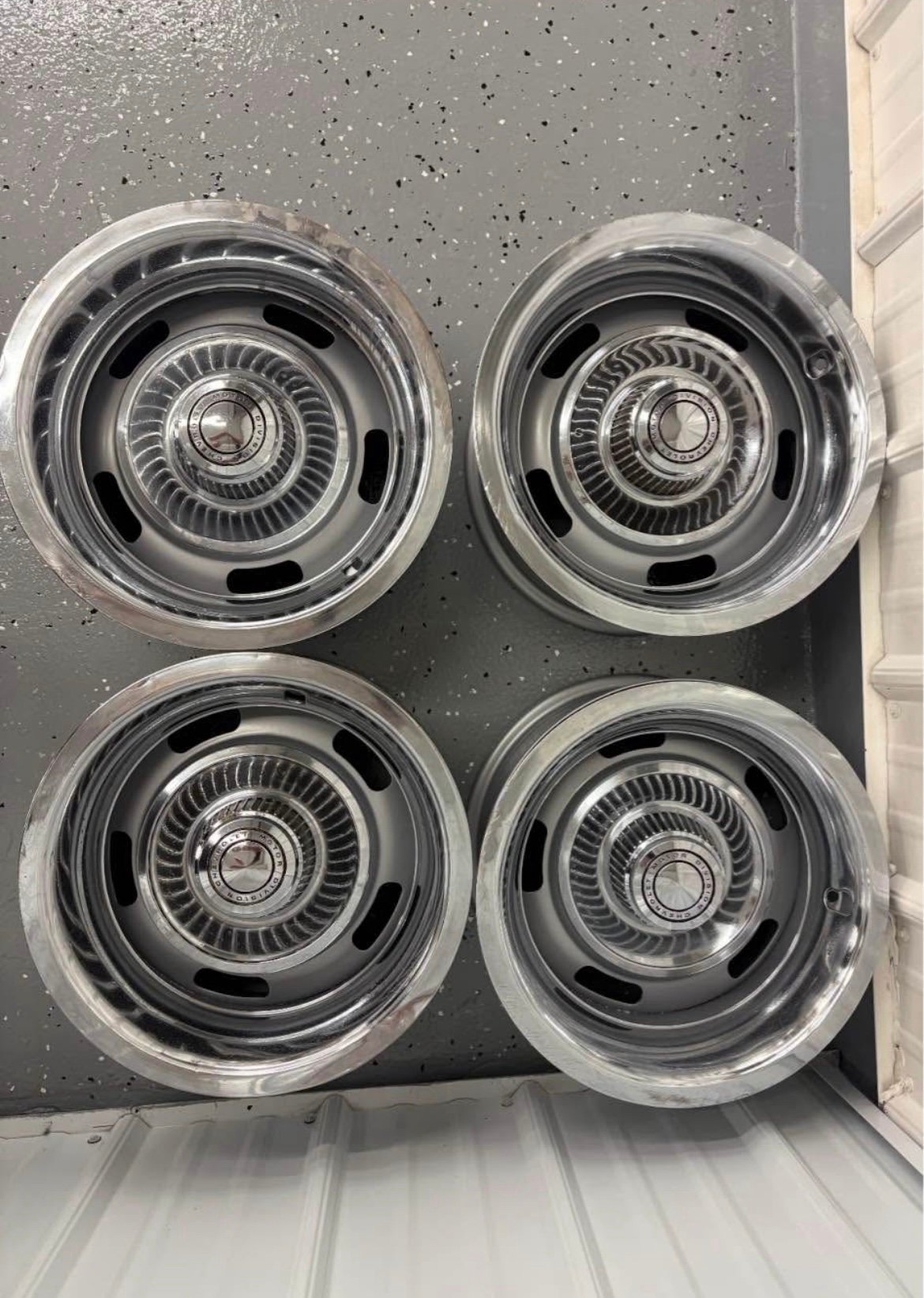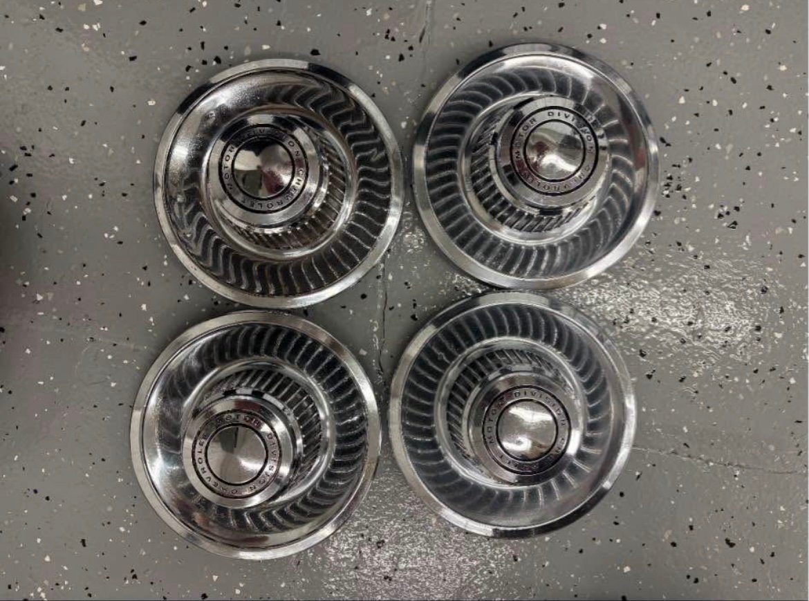 These wheels have been sand blasted and powder coated. Also included are the original center caps and beauty rings. The center caps are in good condition for their age. The beauty rings have some dents and scuff marks with some discoloration on one. These rings have 4 clips on the back side. On 2 of the rings there are 3 clips as 1 clip on each ring is broken. I have owned these wheels, center caps, and beauty rings since 1969. They were used sparingly until around 1980. They are off of a 1969 Corvette 2 top convertible 427/435 bought new off the showroom floor at Devoe Chevrolet