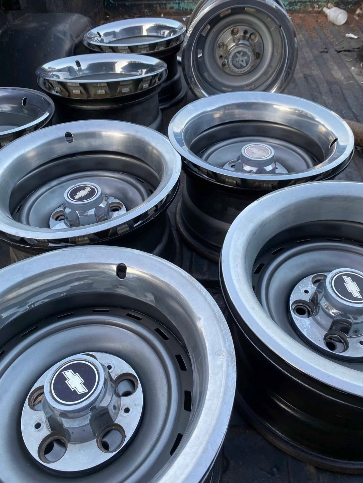 Set of Rallys 15×8 (5X5) feet chevys trucks C10, square body, obs etc,, with caps and Beauty Rings,