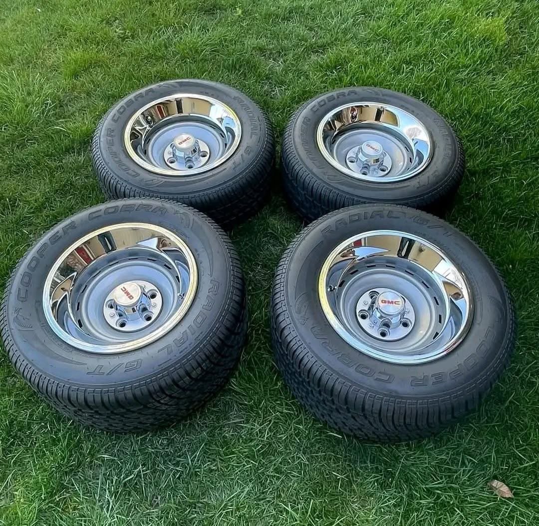 (2) 15×8 with 245/60/15 and (2) 15×10 with 295/50/15 tires.